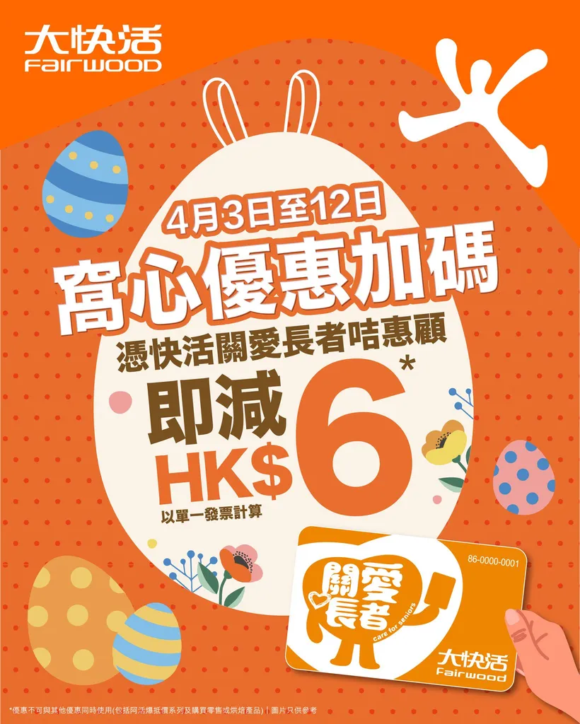 憑快活關愛長者咭惠顧,以單一發票計算。優惠不可與其他優惠同時使用(包括快活抵價系列及購買零售或烘焙產品)。圖片只供參考。
