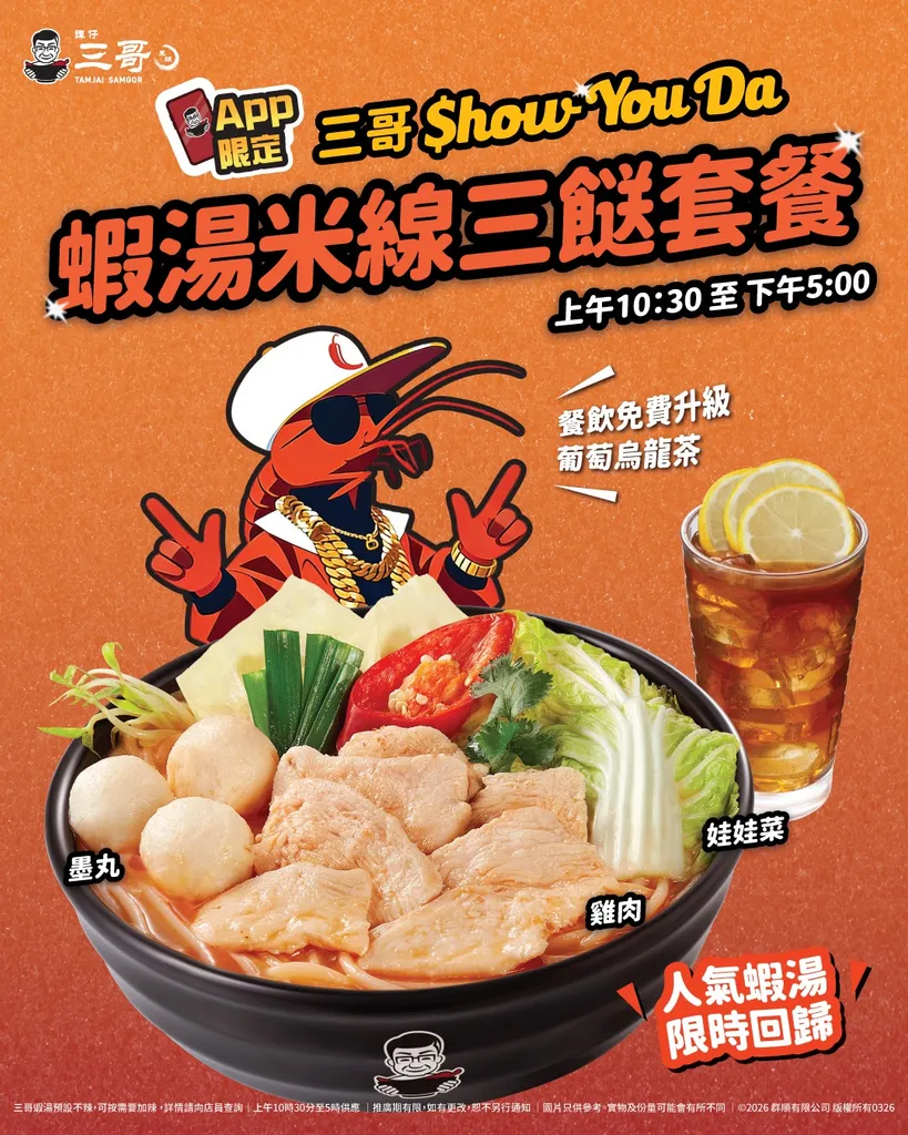 三哥蝦湯預設不辣,可按需要加辣,詳情請向店員查詢。上午10時30分至5時供應。推廣期有限,如有更改,恕不另行通知。圖片只供參考,實物及份量可能會有所不同。©2026 鮮娛有限公司 版權所有 0326