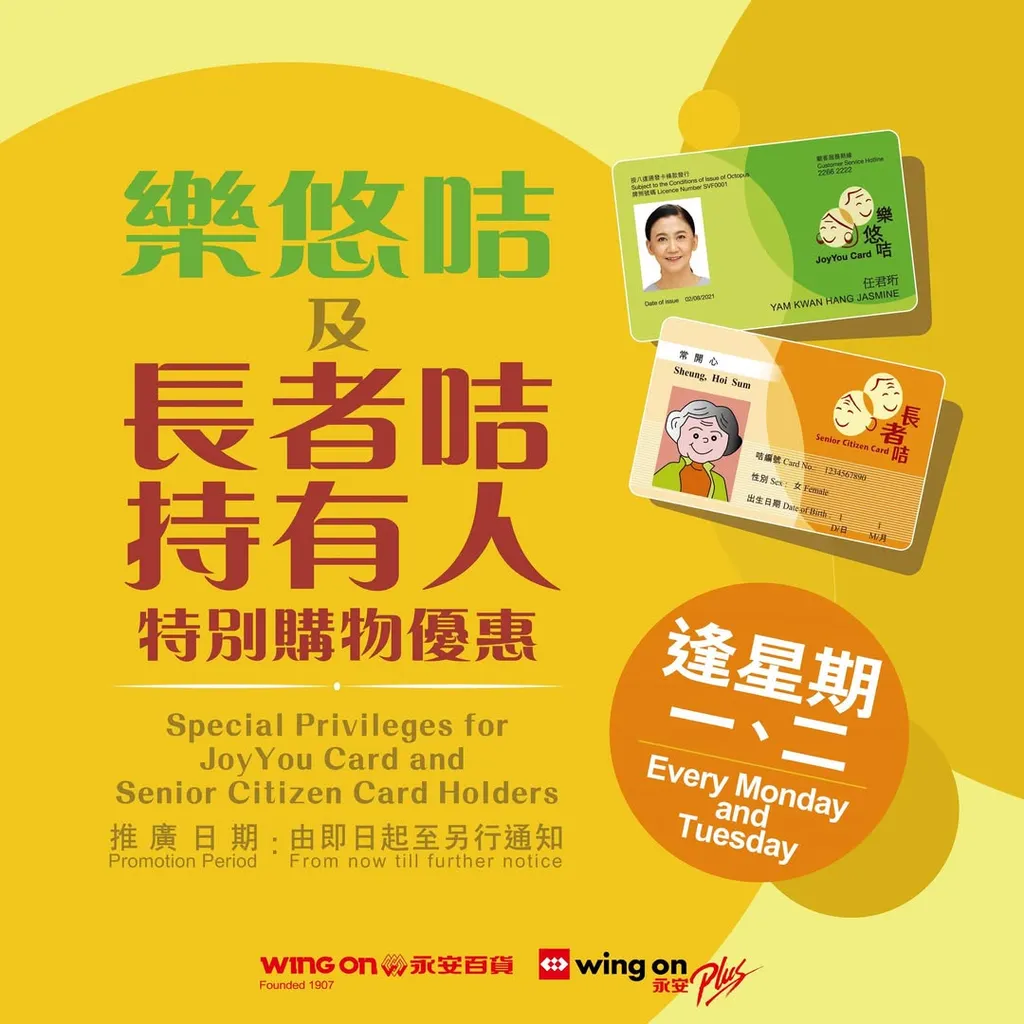 樂悠咭及長者咭持有人特別購物優惠。推廣日期:由即日起至另行通知。逢星期一、二。