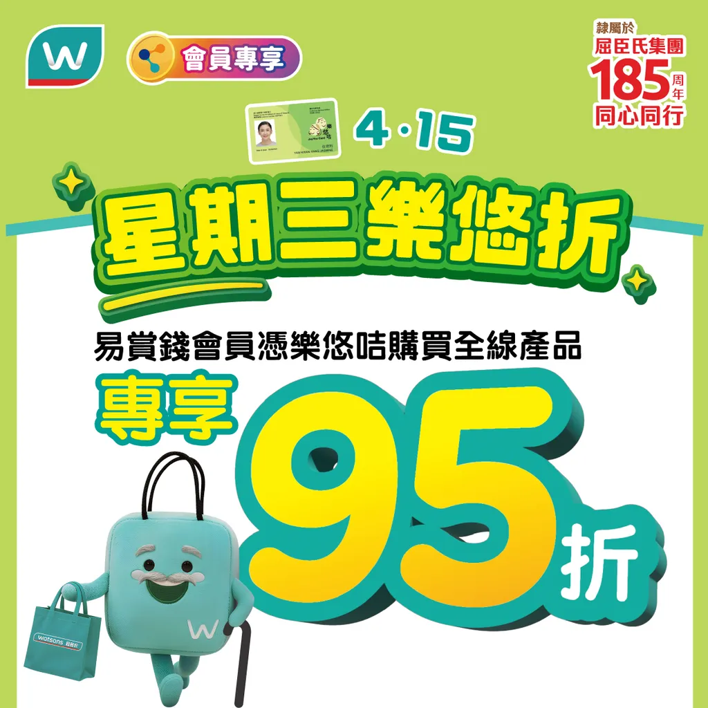 • 優惠只適用於星期三,易賞錢會員憑樂悠咭購買全線產品專享95折。