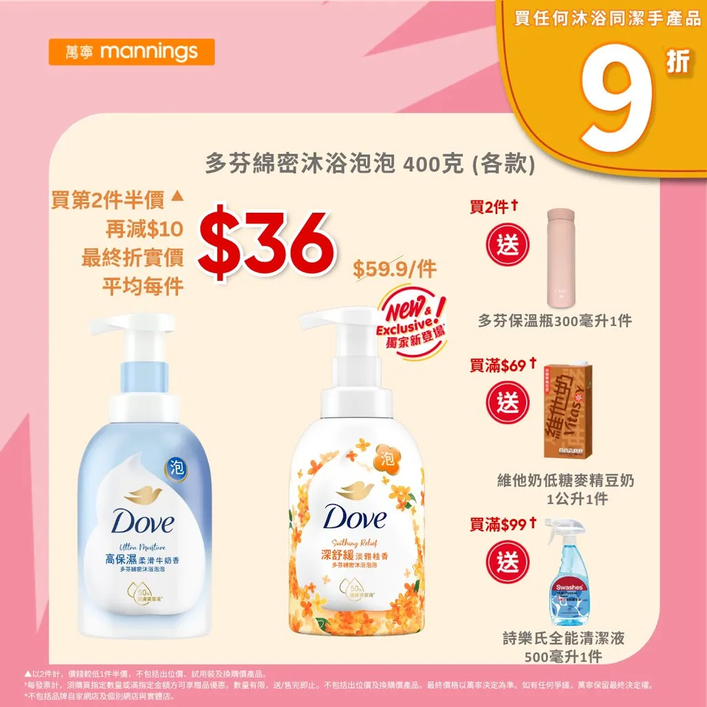 - 購買多芬綿密沐浴泡泡滿$99。每發票計,須購買指定數量或滿指定金額方可享贈品優惠。數量有限,送/售完即止。不包括出位價及換購價產品。最終價格以萬寧決定為準。如有任何爭議,萬寧保留最終決定權。不包括品牌自家網站及個別網店與實體店。