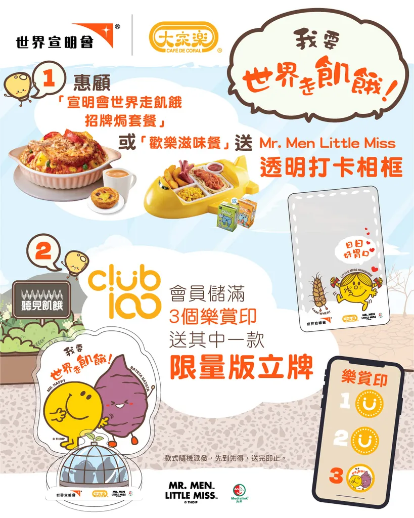 - 惠顧「宣明會世界走飢餓招牌焗套餐」或「歡樂滋味餐」