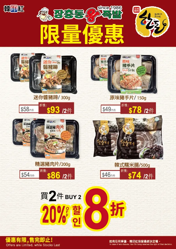 優惠有限,售完即止。太古分店價格有別。活動優惠受條件及細則約束。如有任何爭議,韓印紅保留最終決定權。