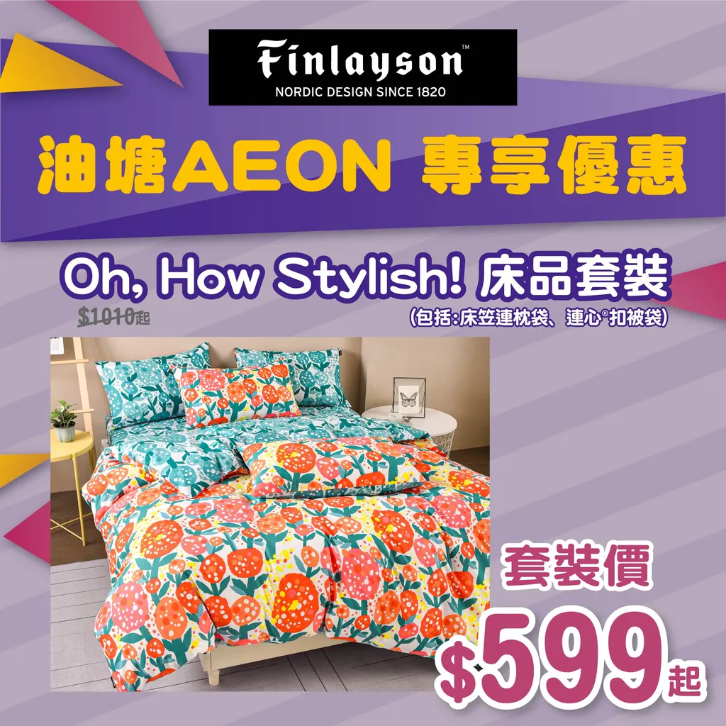 - 套裝包括:床笠連枕袋、連心扣被袋。油塘AEON專享優惠。原價$1010起。