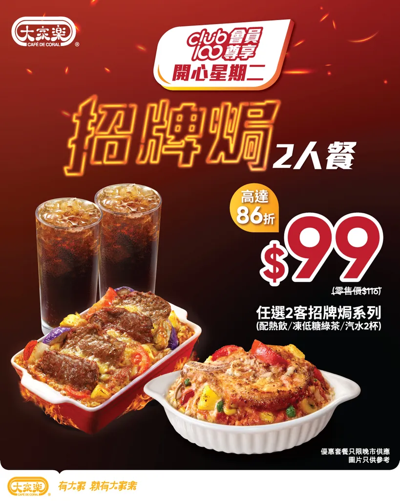 - Club 100 會員尊享 優惠套餐只限晚市供應 圖片只供參考