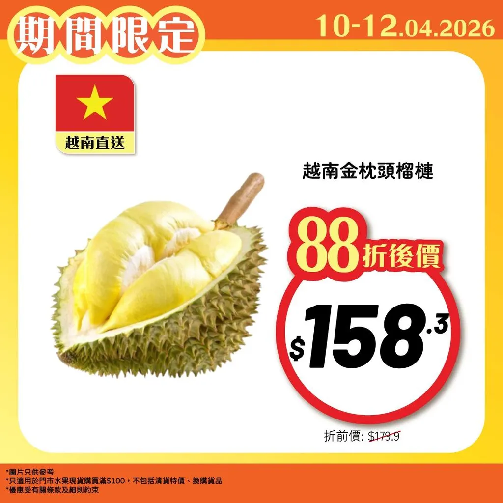 - 圖片只供參考 只適用於門市水果現貨購買滿$100, 不包括清貨特價、換購貨品 優惠受有關條款及細則約束