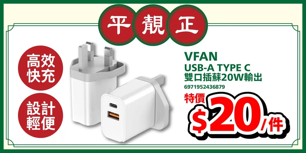 VFAN USB-A TYPE C 雙口插蘇 20W輸出