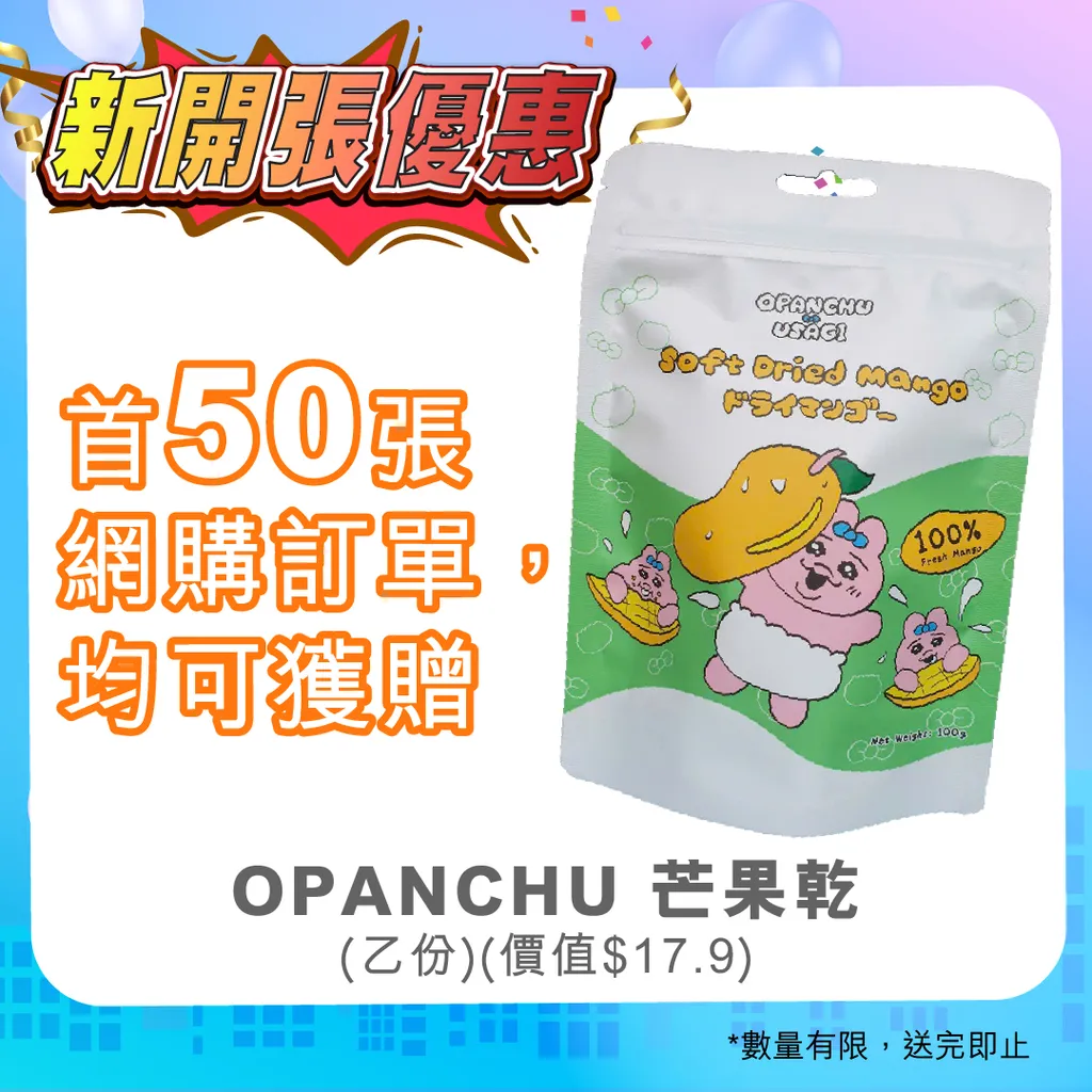 - 首50張網購訂單,均可獲贈OPANCHU 芒果乾。數量有限,送完即止。