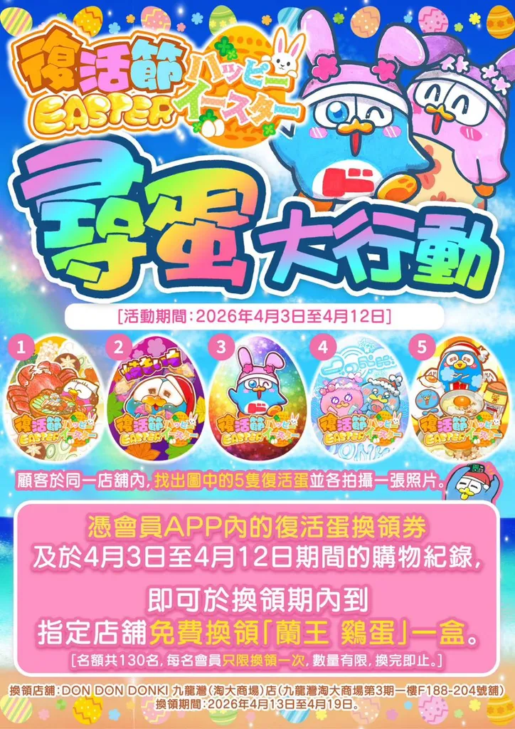 - 顧客須於同一店舖內找出圖中5隻復活蛋並各拍攝一張照片,並憑會員APP內的復活蛋換領券及於2026年4月3日至2026年4月12日期間的購物紀錄,方可於2026年4月13日至2026年4月19日期間到DON DON DONKI九龍灣(淘大商場)店免費換領「蘭王 雞蛋」一盒。名額共130名,每名會員只限換領一次,數量有限,換完即止。